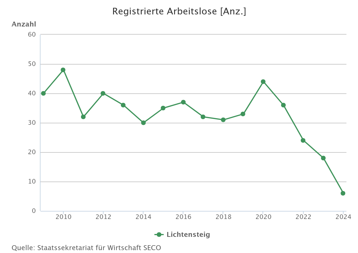 - Registrierte Arbeitslose (Jahr 2024): 6 Personen (Vergleich Jahr 2020: 44 Personen)