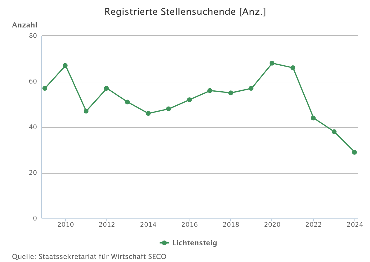 - Registrierte Stellensuchende (Jahr 2024): 29 Personen (Vergleich Jahr 2020: 68 Personen)