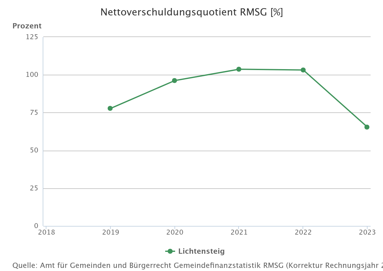 - Nettoverschuldungsquotient RMSG (Jahr 2023): 65.4% (Vergleich Jahr 2020: 96.2%)